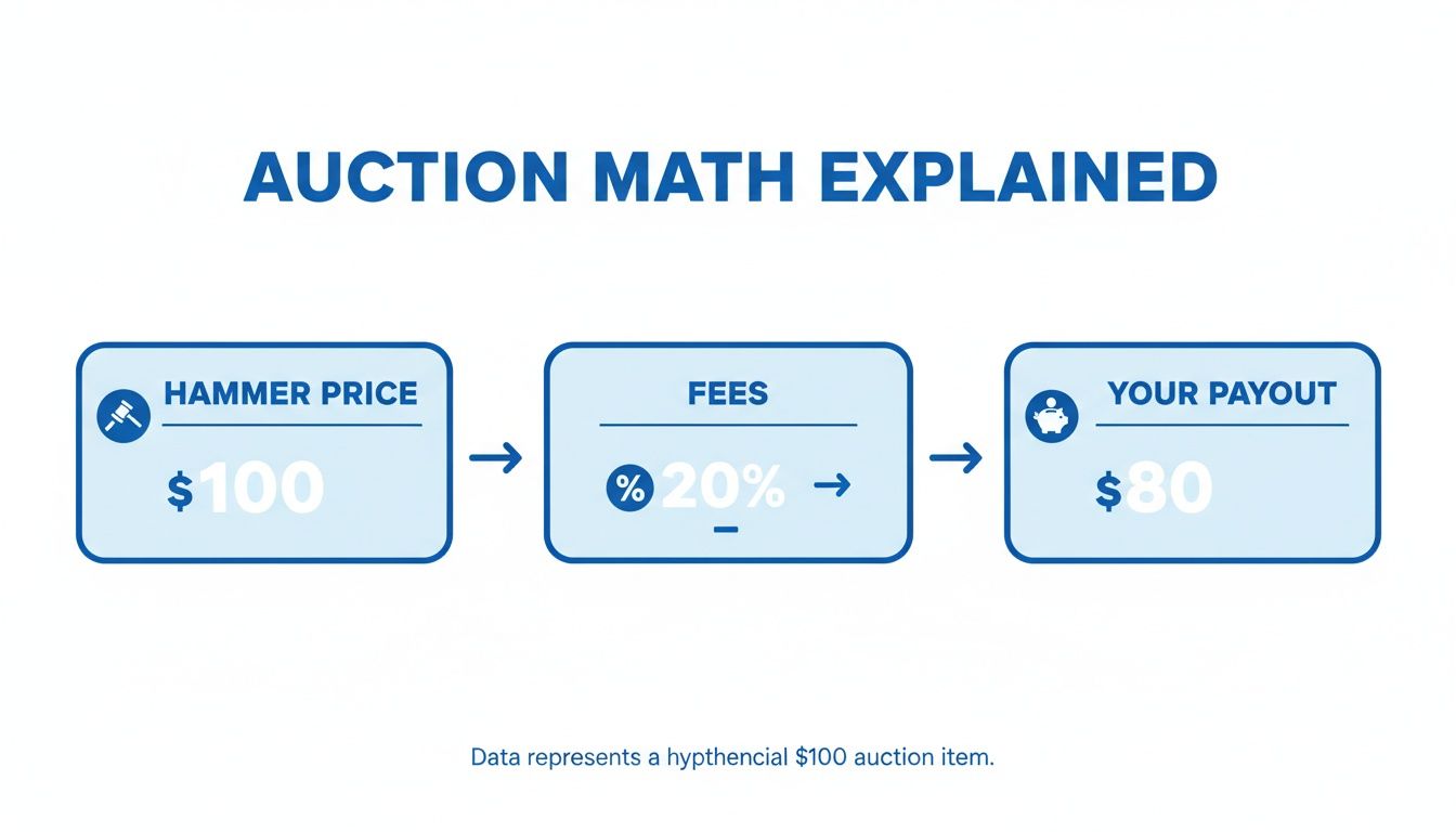 The math itself is simple. The auction's final sale price, often called the hammer price, gets hit by the commission percentage, and what's left is your payout.